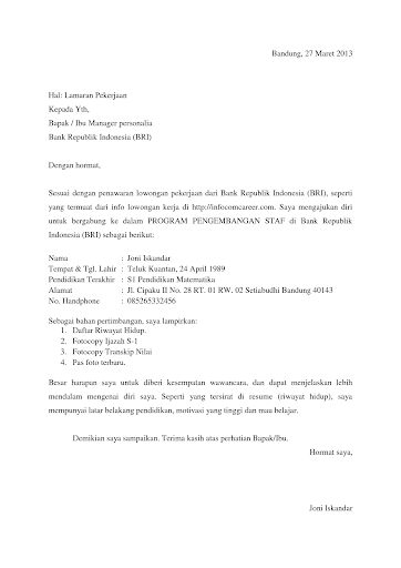 Di antara alasannya, barangkali karena pendapatannya lebih lumayan besar. Diantaranya teller, customer service, relationship officer, marketing, dan sebagainya. Salah satu berkas penting yang harus dipersiapkan saat melamar kerja adalah surat lamaran pekerjaan. Pendaftaran ini dibuka hingga 31 desember 2020. Bagi anda yang akan melamar pekerjaan di bank untuk tahun 2017 berikut ini akan kami berikan informasi cara membuat surat lamaran kerja di bank terbaru.